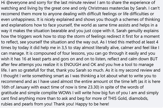 Every module is taught with a practical explanation that helps you understand the root of the issue and how to address it quickly and effectively, followed by a clear explanation of how to actually DO differently when you’re actually at the Christmas celebrations.