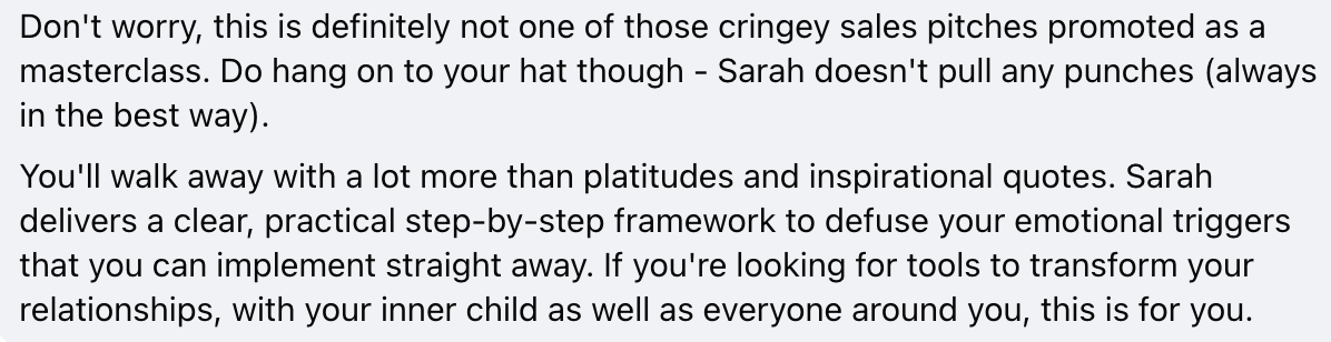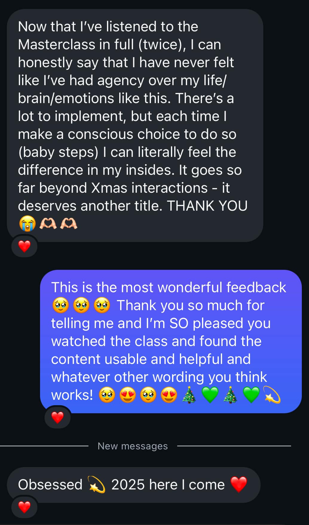 You don’t have to stay stuck in old patterns, get hijacked by your emotions, or dread the festive season. These masterclasses are designed to give you practical tools, deep insight, and real change you can use right away.